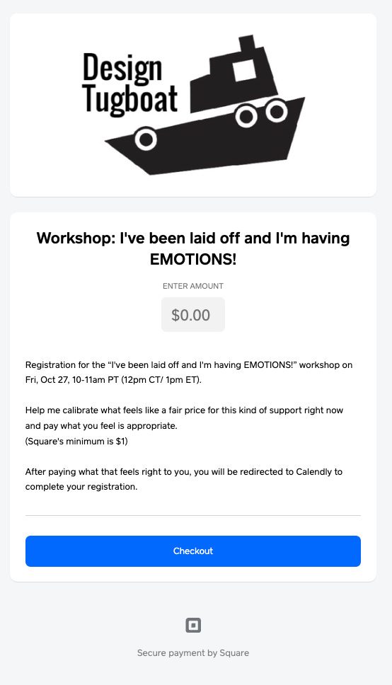 Building on what I had learned, I offered a workshop around helping people engage with difficult emotions around job loss. I intentionally avoided asking people to tackle grief head-on. I ran two workshops with a small number of people. Those workshops were my learning labs to play with not just how to guide people through grief and how to talk about it, but also how to run an online workshop. Very meta! I learned about the mechanics around taking online payments for a workshop, and I explored “pay what you think is appropriate” models to help me understand perceptions of value. I dipped my toes into how to use social media to reach beyond the communities I already touch. The results were mixed, but with each experiment, my confidence and knowledge grew.