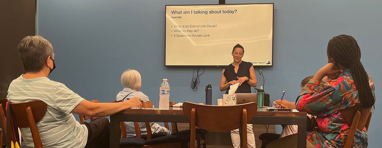 I reached out to a local senior center that I have a relationship with and offered to give a talk on what an End-of-Life Doula is (EOL Doula, for short). Knowing I'd have an eager audience and a time constraint challenged me to be articulate, engaging, and concise.