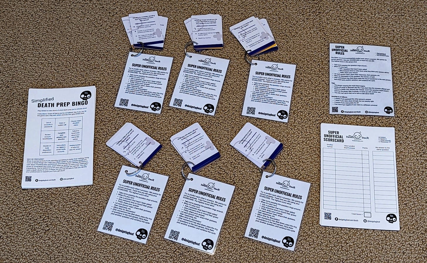 I had an absolute blast coming up with how we’d play. I hadn’t asked people to RSVP, so I didn’t know if I should expect 1 person or 100. Oops—but instant learning! My new friends at the Death Deck had suggested putting the cards on rings to allow for easy cleanup. I got to work creating rules that could still work even if the event was big enough that I couldn’t facilitate some of the groups myself. I had prizes for the winners of made-up categories. I also created a simplified Death Prep BINGO card to personalize the abstract topic of End-of-Life planning and give people something tangible as a take-away.