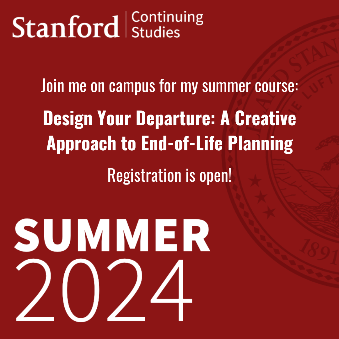 I thought you might be interested in a new course that my friend is teaching this summer in the Stanford Continuing Studies Program. It's called Design Your Departure: A Creative Approach to End-of-Life Planning. I think this kind of courageous exploration is right up your alley!